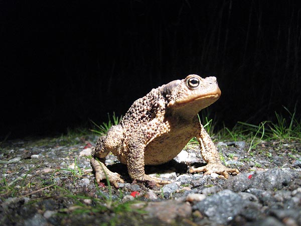 Iltahuuto päättyi yhdeksän jälkeen, ja oli säkkipimeää. Utön kylän raitti täyttyy öiseen aikaan rupikonnista.